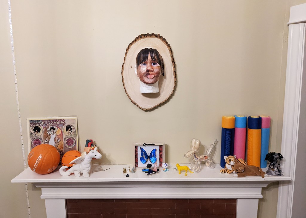 - A metaphor for the feeling of growing up as a trans child, collections of childhood photos printed on magazine are clipped and paper-mached onto the styrofoam bust of a man.