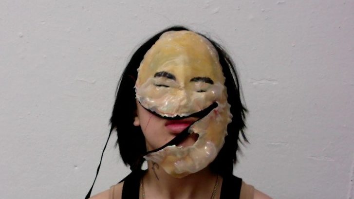 Inspired by Regina Jose Galindo, Jayme dawns a mask handcrafted to resemble racist caricatures of East Asians with a zipper sewn through the middle to reference the derogatory term Zipperhead.