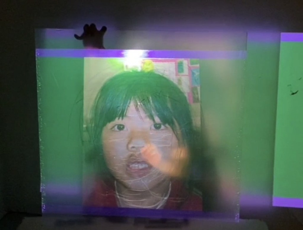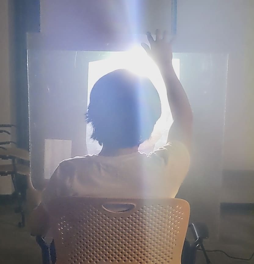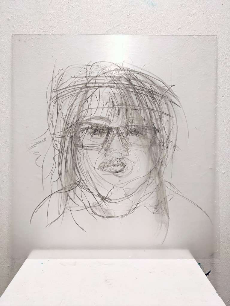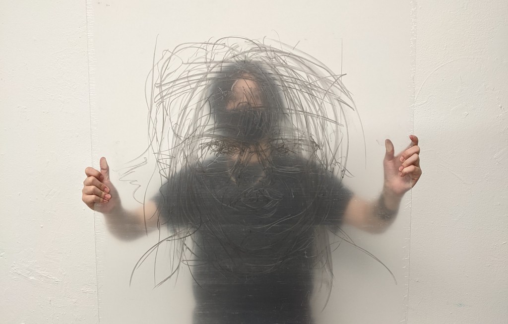 Jayme sits behind a semi-translucent easel which doubles as the screen for a projector showing a video of Jayme’s face during different life stages morphing into each other. Jayme tries to draw a single self portrait in vain as the person he studies is never quite the same any time he views.
